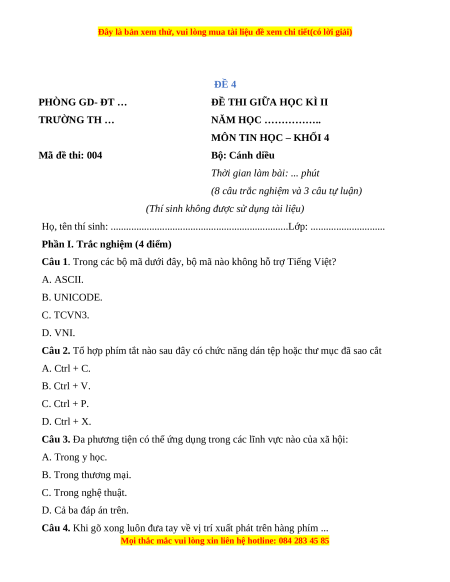 MÔN TIN HỌC – KHỐI 4 Mã đề thi: 004 Bộ: Cánh diều