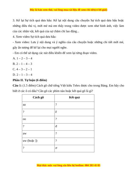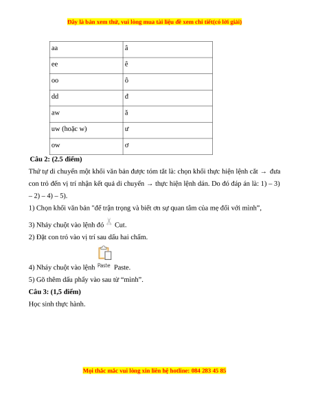 Câu 1: (1.5 điểm) Cách gõ chữ tiếng Việt kiểu Telex được cho trong Bảng. Em hãy cho