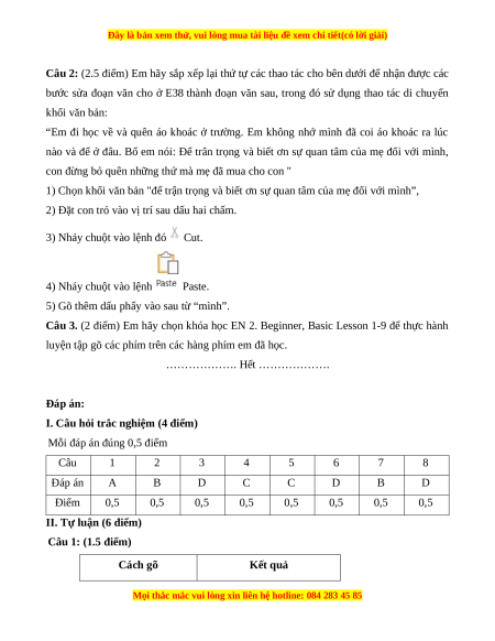 II. Tự luận (6 điểm) Câu 1: (1.5 điểm) Cách gõ Kết quả
