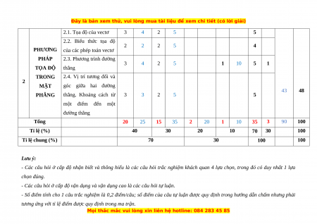 2.4. Vị trí tương đối và 2 MẶT góc giữa hai đường 43 48 PHẲNG thẳng. Khoảng cách từ 3 3 2 5 5 một điểm đến một đường thẳng Tổng 20 25 15 35 2 20 1 10 35 3 90 100 Tỉ lệ (%) 40 30 20 10 70 30 100 Tỉ lệ chung (%) 70 30 100 100 Lưu ý: