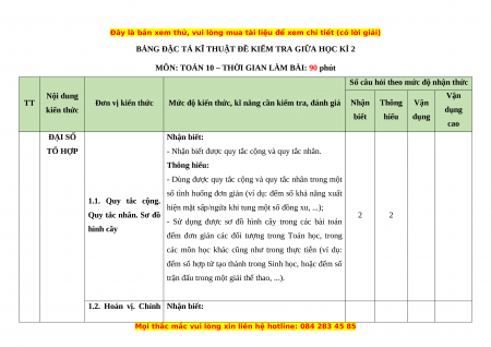 Đơn vị kiến thức tổng kiến thức Thời Thời Thời Thời gian Số Số Số Số điểm gian gian gian gian TN TL (phút) CH CH CH CH (phút) (phút) (phút) (phút) 1.1. Quy tắc cộng. Quy tắc nhân. Sơ đồ hình 2 3 2 4 4 ĐẠI SỐ cây 1 47 52 TỔ HỢP 1.2. Hoán vị. Chỉnh hợp 3 3 2 4 1 10 5 1 1.3. Tổ hợp 2 3 2 5 4 1.4. Nhị thức Newton 2 3 1 2 1 10 3 1