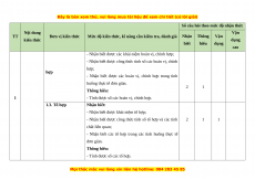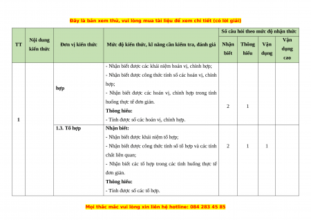 Đơn vị kiến thức tổng kiến thức Thời Thời Thời Thời gian Số Số Số Số điểm gian gian gian gian TN TL (phút) CH CH CH CH (phút) (phút) (phút) (phút) 1.1. Quy tắc cộng. Quy tắc nhân. Sơ đồ hình 1 1 1 2 2 ĐẠI SỐ cây 1 34 53,33 TỔ HỢP 1.2. Hoán vị. Chỉnh hợp 2 2 1 2 3 1.3. Tổ hợp 2 2 1 2 1 10 3 1 1.4. Nhị thức Newton 1 1 1 2 1 10 2 1