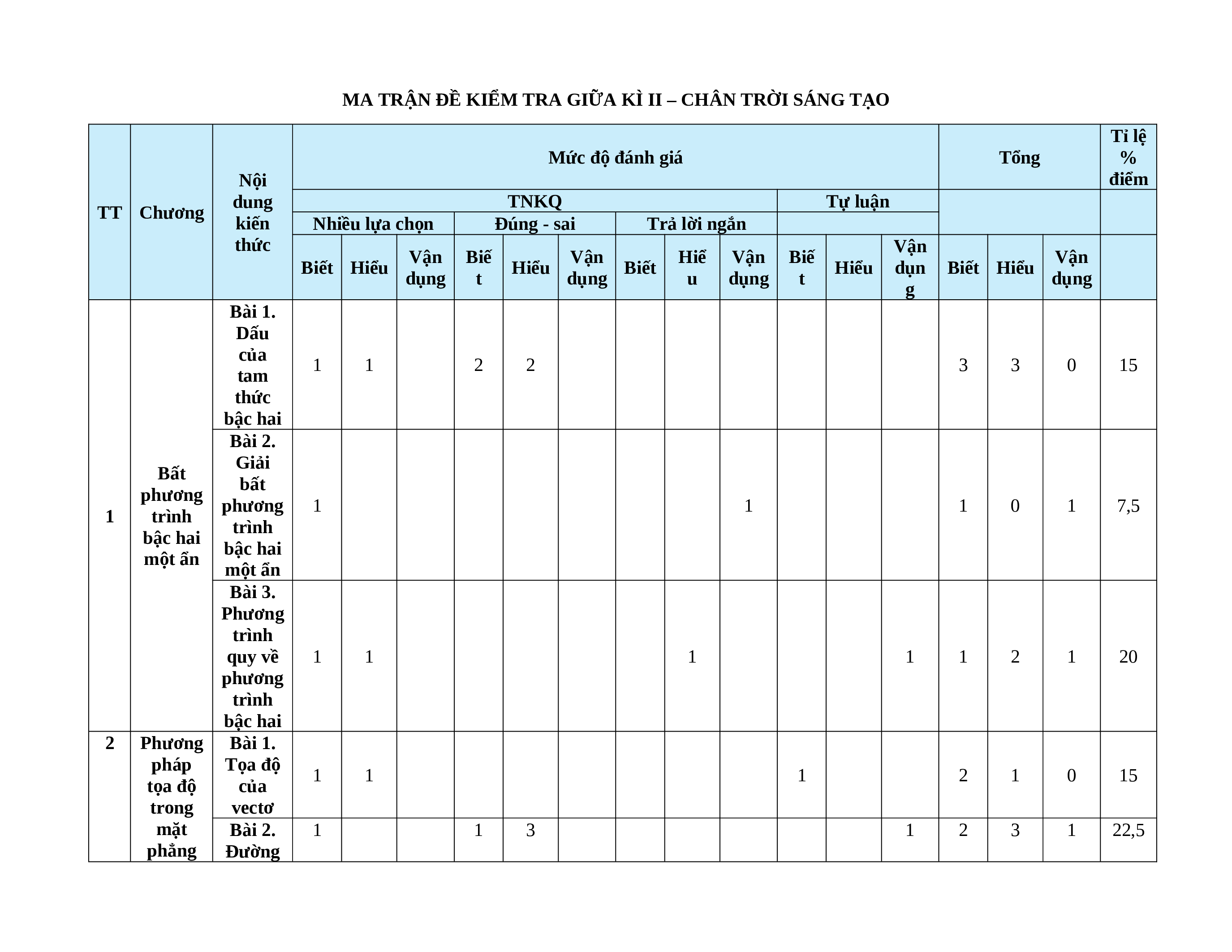 MA TRẬN ĐỀ KIỂM TRA GIỮA KÌ II – CHÂN TRỜI SÁNG TẠO Tỉ lệ Mức độ đánh giá Tổng % Nội điểm dung TNKQ Tự luận TT Chương kiến Nhiều lựa chọn Đúng - sai Trả lời ngắn thức Vận Vận Biế Vận Hiể Vận Biế Vận Biết Hiểu Hiểu Biết Hiểu dụn Biết Hiểu dụng t dụng u dụng t dụng g Bài 1. Dấu của 1 1 2 2 3 3 0 15 tam thức bậc hai Bài 2. Giải Bất bất phương phương 1 1 1 0 1 7,5 1 trình trình bậc hai bậc hai một ẩn một ẩn Bài 3. Phương trình quy về 1 1 1 1 1 2 1 20 phương trình bậc hai 2 Phương Bài 1. pháp Tọa độ 1 1 1 2 1 0 15 tọa độ của trong vectơ mặt Bài 2. 1 1 3 1 2 3 1 22,5 phẳng Đường thẳng trong mặt phẳng tọa độ Bài 3. Đường tròn trong 1 1 1 2 1 0 10 mặt phẳng tọa độ Bài 4. Ba đường conic 1 1 1 1 1 1 10 trong mặt phẳng tọa độ Tổng số câu 7 5 0 3 5 0 1 1 2 1 0 2 12 11 4 Tổng số điểm 3,0 2,0 2,0 3,0 4,0 3,0 3,0 10 Tỉ lệ % 30 20 20 30 40 30 30 100 Lưu ý: