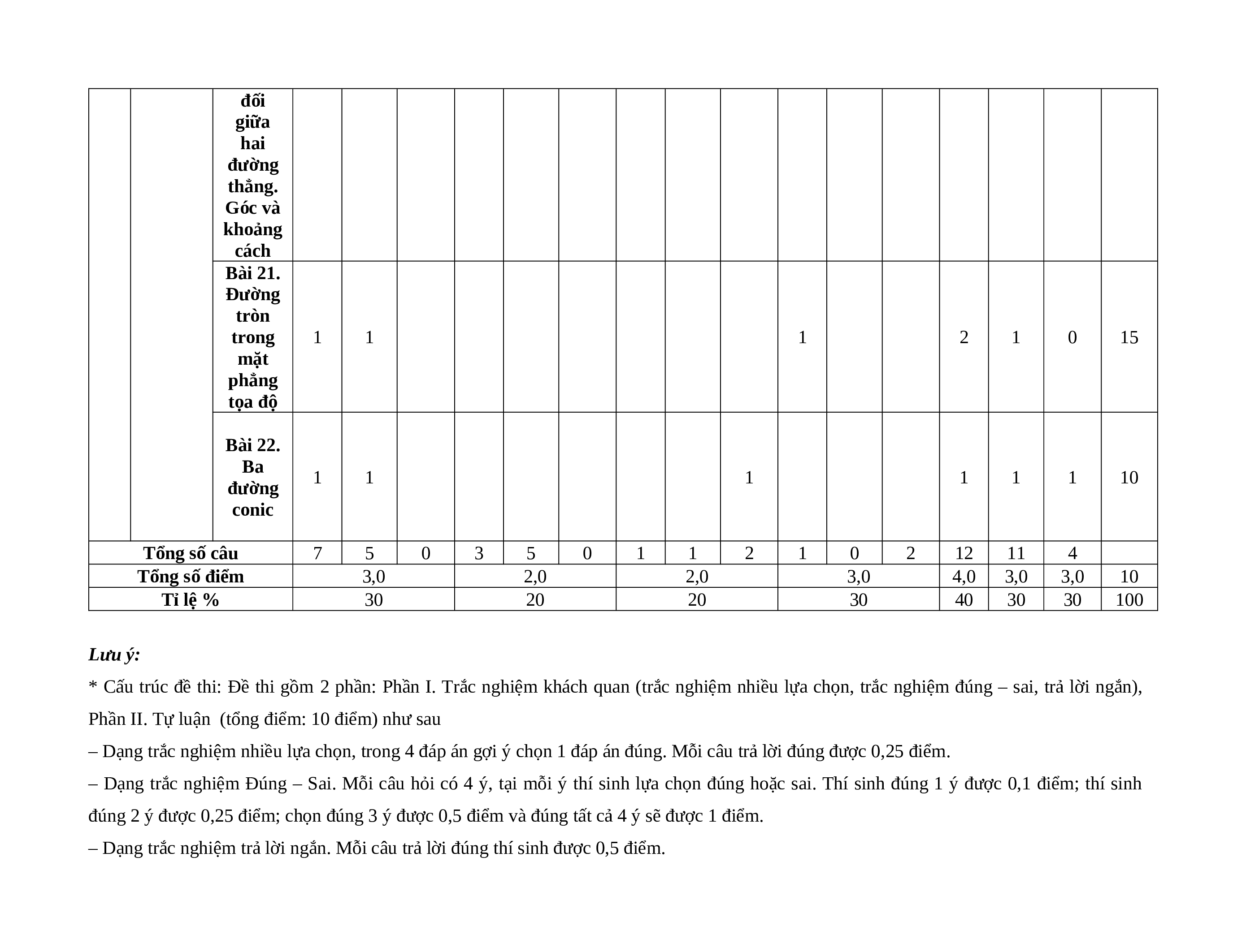 MA TRẬN ĐỀ KIỂM TRA GIỮA KÌ II – KẾT NỐI TRI THỨC Tỉ lệ  Mức độ đánh giá Tổng %  Nội  điểm dung  TNKQ Tự luận TT Chương kiến  Nhiều lựa chọn Đúng - sai Trả lời ngắn thức Vận  Vận Biế Vận  Hiể Vận Biế Vận  Biết Hiểu Hiểu Biết Hiểu dụn Biết Hiểu dụng t dụng u dụng t dụng g Bài 15.  1 1 2 0 0 7,5 Hàm số Bài 16.  Hàm số  1 1 2 1 3 1 1 20 bậc hai Bài 17.  Dấu  Hàm số,  của  1 1 2 1 1 3 1 15 đồ thị  tam  1 và ứng  thức  dụng bậc hai Bài 18.  Phương  trình  quy về  1 1 0 1 1 7,5 phương  trình  bậc hai 2 Phương Bài 19.  pháp  Phương  tọa độ  trình  1 1 2 1 2 2 1 20 trong  đường  mặt  thẳng phẳng Bài 20.  1 1 1 1 0 5 Vị trí  tương  đối  giữa  hai  đường  thẳng.  Góc và  khoảng  cách Bài 21.  Đường  tròn  trong  1 1 1 2 1 0 15 mặt  phẳng  tọa độ Bài 22.  Ba  1 1 1 1 1 1 10 đường  conic Tổng số câu 7 5 0 3 5 0 1 1 2 1 0 2 12 11 4 Tổng số điểm 3,0 2,0 2,0 3,0 4,0 3,0 3,0 10 Tỉ lệ % 30 20 20 30 40 30 30 100 Lưu ý: