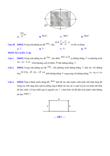 để làm vườn. Có bao nhiêu giá trị nguyên của ( như hình vẽ) để diện tích mảnh vườn không bé hơn ? ---- HẾT ----