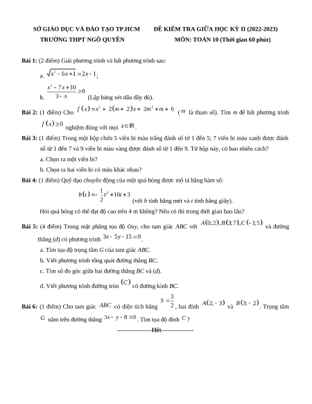 Đề thi giữa kì 2 Toán 10 trường THPT Ngô Quyền - TP Hồ Chí Minh năm 2022-2023