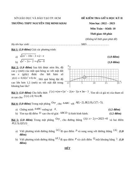 Đề thi giữa kì 2 Toán 10 trường THPT Nguyễn Thị Minh Khai - TP Hồ Chí Minh năm 2022-2023