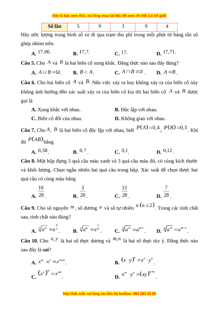 Câu 7. Cho , là hai biến cố độc lập với nhau, biết ; . Khi đó bằng A. . B. . C. . D. .
