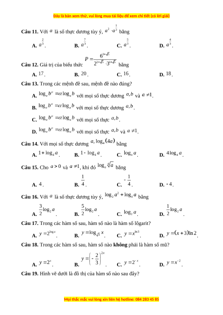 Câu 14. Với mọi số thực dương bằng A. . B. . C. . D. . Câu 15. Cho và , khi đó bằng A. . B. . C. . D. .