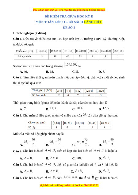 MÔN TOÁN LỚP 11 – BỘ SÁCH CÁNH DIỀU ĐỀ SỐ 3