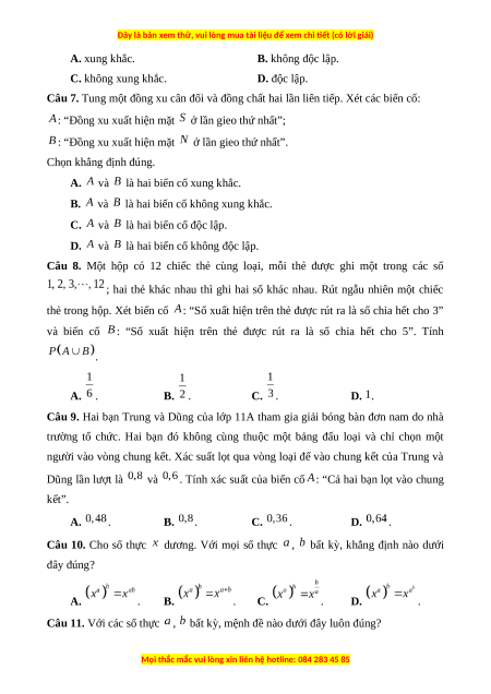 Câu 7. Tung một đồng xu cân đối và đồng chất hai lần liên tiếp. Xét các biến cố: