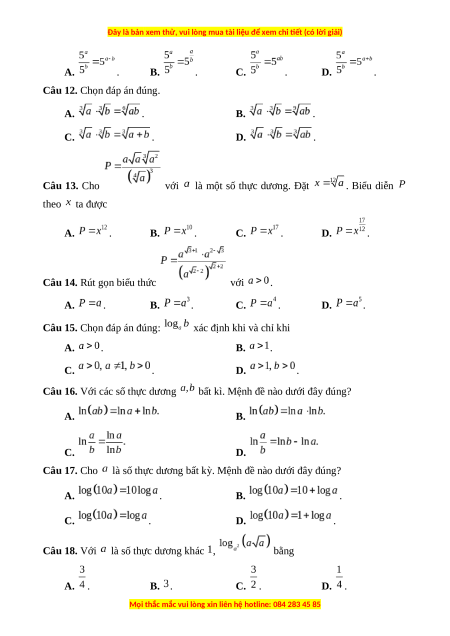 Câu 18. Với là số thực dương khác , bằng A. . B. . C. . D. .