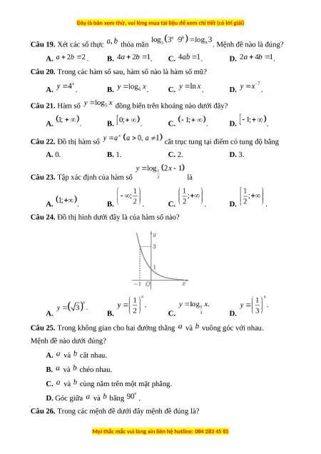Câu 20. Trong các hàm số sau, hàm số nào là hàm số mũ? A. . B. . C. . D. . Câu 21. Hàm số