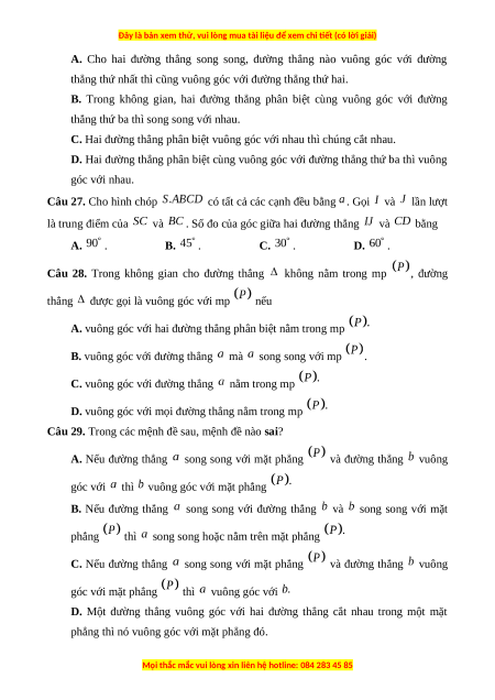 Câu 25. Trong không gian cho hai đường thẳng và vuông góc với nhau.