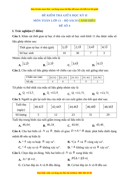 MÔN TOÁN LỚP 11 – BỘ SÁCH CÁNH DIỀU ĐỀ SỐ 4