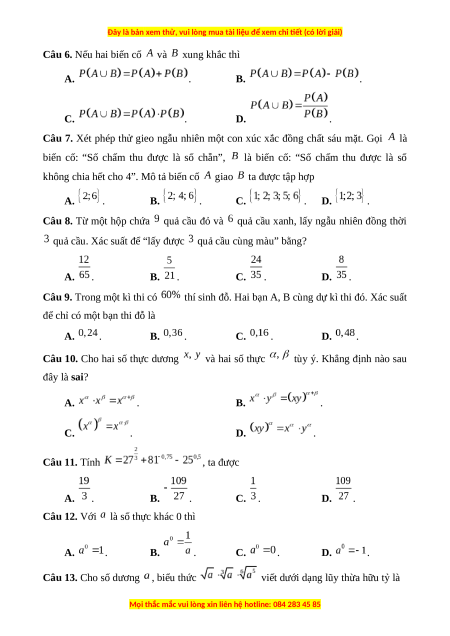 Câu 6. Nếu hai biến cố và xung khắc thì A. . B. . C. . D. .