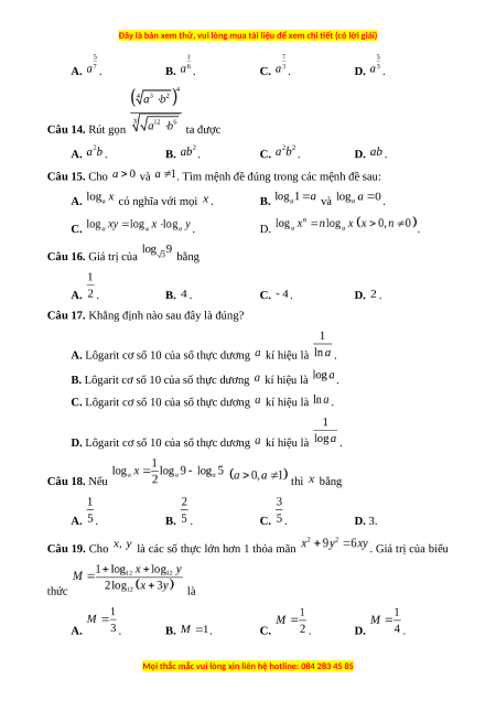 D. Lôgarit cơ số 10 của số thực dương kí hiệu là . Câu 18. Nếu thì bằng A. . B. . C. . D. 3. Câu 19. Cho
