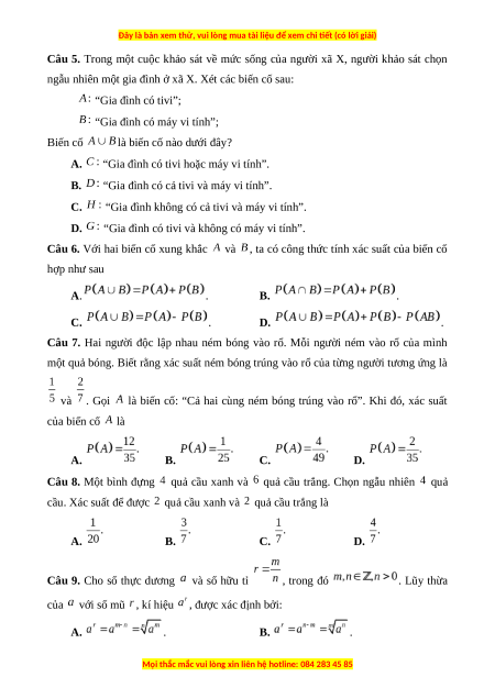 Câu 5. Trong một cuộc khảo sát về mức sống của người xã X, người khảo sát chọn