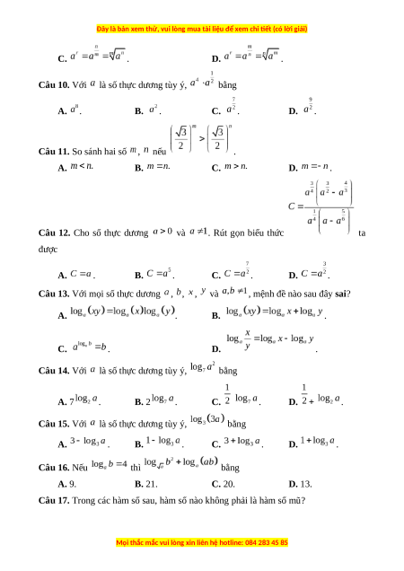 Câu 15. Với là số thực dương tùy ý, bằng A. . B. . C. . D. . Câu 16. Nếu thì bằng A. 9. B. 21. C. 20. D. 13.