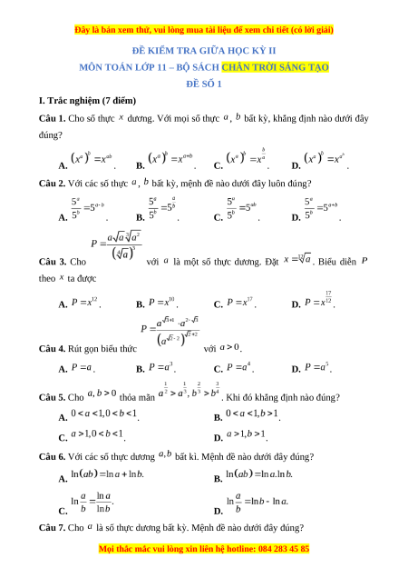Câu 7. Cho là số thực dương bất kỳ. Mệnh đề nào dưới đây đúng?