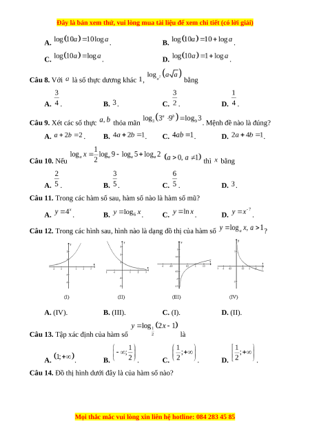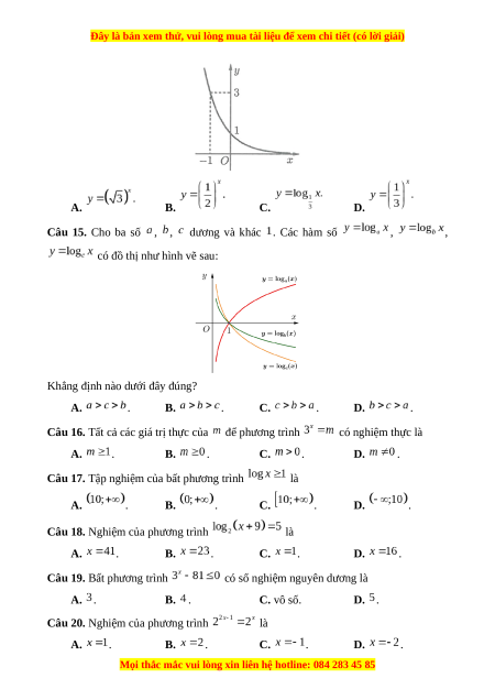Câu 15. Cho ba số , , dương và khác . Các hàm số , ,