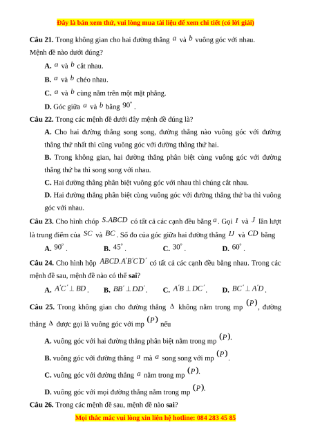 Câu 21. Trong không gian cho hai đường thẳng và vuông góc với nhau.