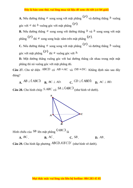 Câu 25. Trong không gian cho đường thẳng không nằm trong mp , đường