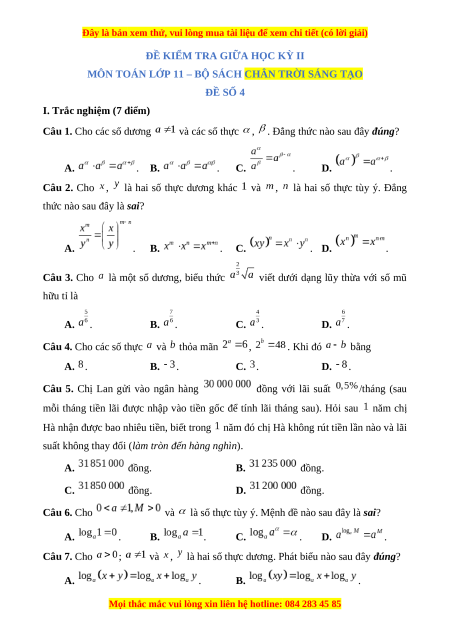 và là số thực tùy ý. Mệnh đề nào sau đây là sai? A. . B. . C. . D. . Câu 7. Cho ;