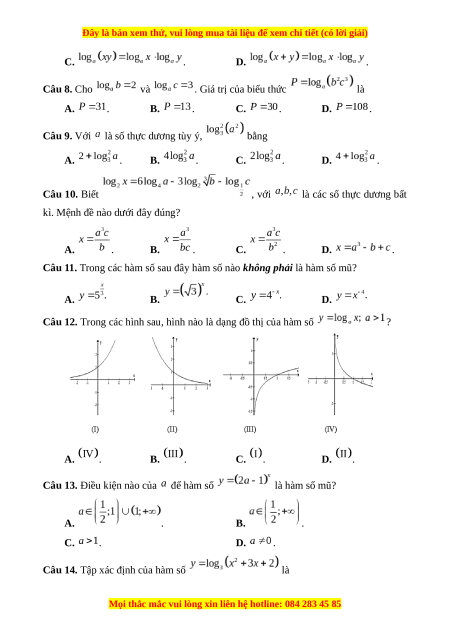 Câu 9. Với là số thực dương tùy ý, bằng A. . B. . C. . D. . Câu 10. Biết , với