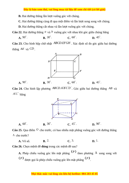 Câu 22. Hai đường thẳng và vuông góc với nhau khi góc giữa chúng bằng A. B. C. D.