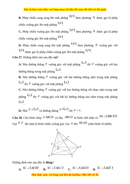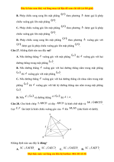Câu 25. Qua điểm cho trước, có bao nhiêu mặt phẳng vuông góc với đường thẳng cho trước? A. Vô số. B. C. D.