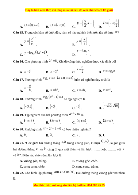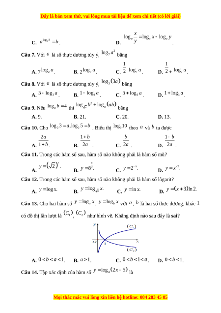 Câu 12. Trong các hàm số sau, hàm số nào không phải là hàm số lôgarit? A. B. C. D.