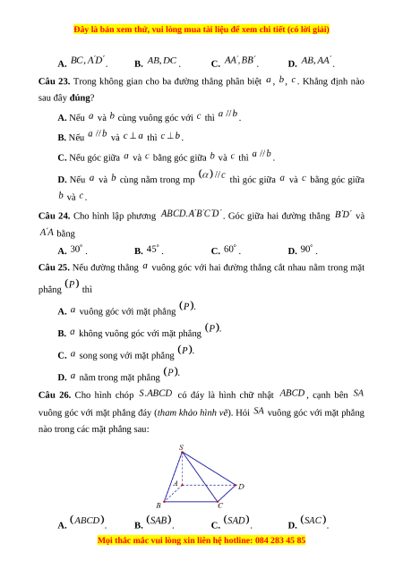Câu 23. Trong không gian cho ba đường thẳng phân biệt , , . Khẳng định nào sau đây đúng?