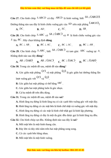 Câu 25. Nếu đường thẳng vuông góc với hai đường thẳng cắt nhau nằm trong mặt phẳng thì