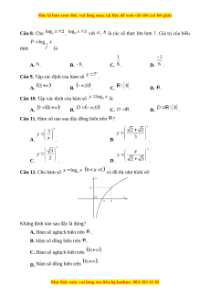 Câu 4. Rút gọn biểu thức với thu được kết quả là A. . B. . C. . D. . Câu 5. Cho