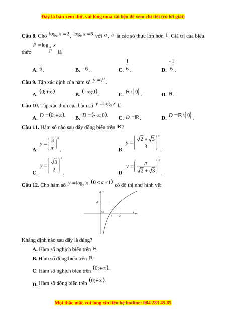 có giá trị bằng bao nhiêu? A. 3. B. . C. . D. . Câu 7. Nếu thì bằng A. . B. . C. . D. .