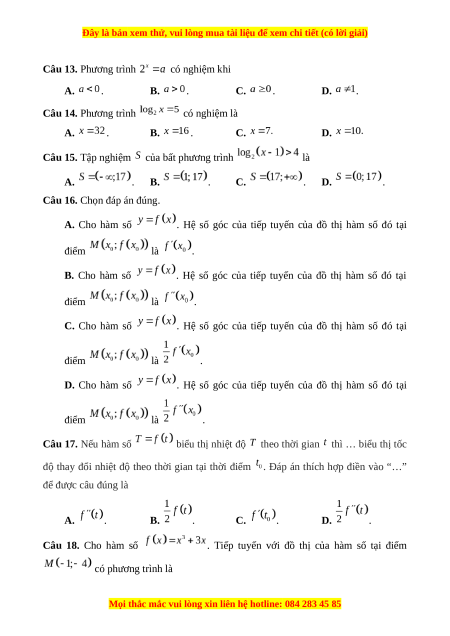 độ thay đổi nhiệt độ theo thời gian tại thời điểm . Đáp án thích hợp điền vào “…” để được câu đúng là A. . B. . C. . D. . Câu 18. Cho hàm số