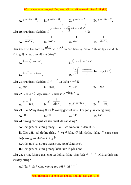 Câu 21. Đạo hàm của hàm số tại điểm là A. . B. . C. . D. . Câu 22. Với , đạo hàm của hàm số là A. . B. . C. . D. .