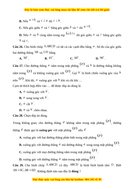 Câu 23. Hai đường thẳng và vuông góc với nhau khi góc giữa chúng bằng A. B. C. D.