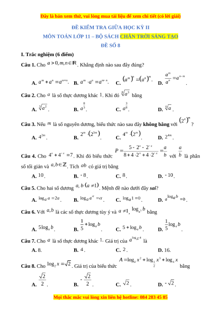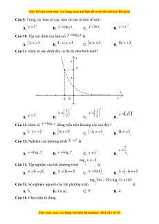 Câu 7. Cho là số thực dương khác Giá trị của là A. 8. B. . C. . D. 16. Câu 8. Cho