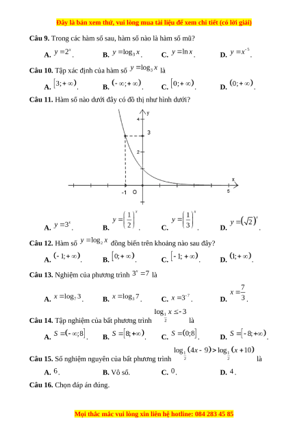 Câu 9. Trong các hàm số sau, hàm số nào là hàm số mũ? A. . B. . C. . D. .