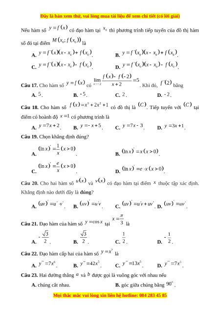 có đạo hàm tại thì phương trình tiếp tuyến của đồ thị hàm số đó tại điểm là A. . B. . C. . D. . Câu 17. Cho hàm số có . Khi đó, bằng A. . B. . C. . D. . Câu 18. Cho hàm số có đồ thị là . Tiếp tuyến với tại điểm có hoành độ có phương trình là A. . B. . C. . D. .