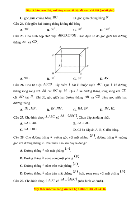 Câu 24. Góc giữa hai đường thẳng không thể bằng A. . B. . C. . D. .