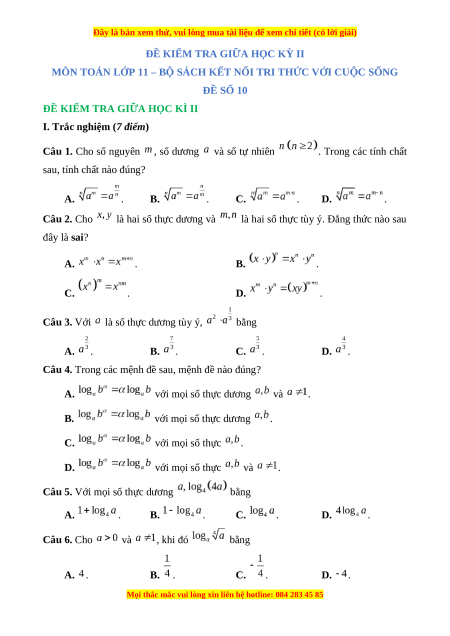 Câu 5. Với mọi số thực dương bằng A. . B. . C. . D. . Câu 6. Cho và , khi đó bằng A. . B. . C. . D. .
