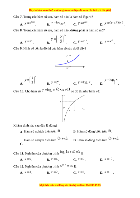 Câu 7. Trong các hàm số sau, hàm số nào là hàm số lôgarit? A. . B. . C. . D. .