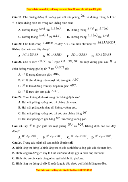 Câu 19. Cho đường thẳng vuông góc với mặt phẳng và đường thẳng khác