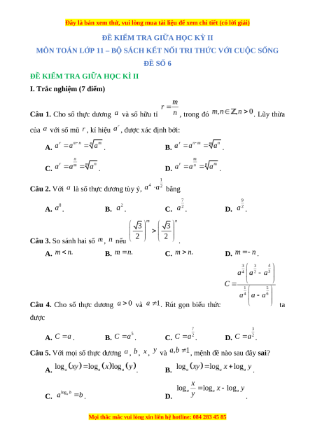 MÔN TOÁN LỚP 11 – BỘ SÁCH KẾT NỐI TRI THỨC VỚI CUỘC SỐNG ĐỀ SỐ 6