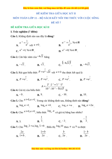 MÔN TOÁN LỚP 11 – BỘ SÁCH KẾT NỐI TRI THỨC VỚI CUỘC SỐNG ĐỀ SỐ 7
