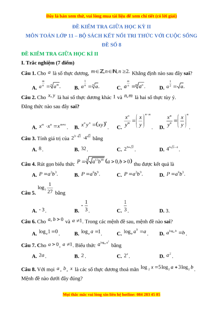 MÔN TOÁN LỚP 11 – BỘ SÁCH KẾT NỐI TRI THỨC VỚI CUỘC SỐNG ĐỀ SỐ 8