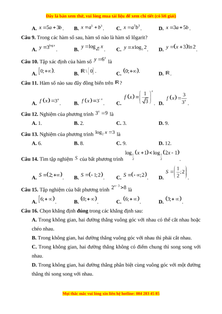 Câu 9. Trong các hàm số sau, hàm số nào là hàm số lôgarit? A. . B. . C. . D. .